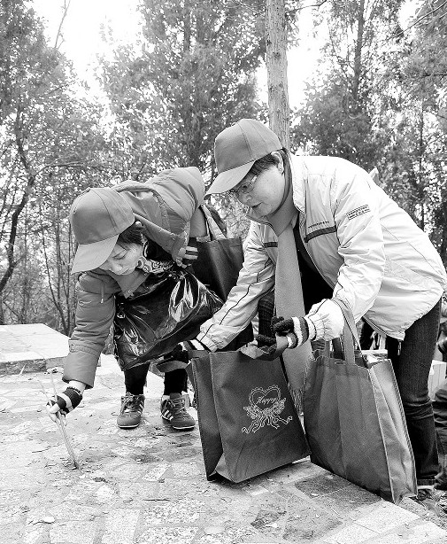 1月17日上午,志愿者正在磨基山上拣垃圾。当日,长江宜昌航道工程局组织30多名党员、团员志愿者登上磨基山,沿途用环保袋拣人们遗留下来的烟头、塑料袋、餐巾纸等废物,为磨基山“洗脸”。 本报记者 黄翔 本报通讯员 宋西平 摄