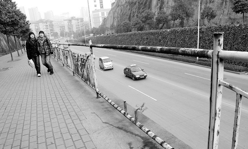 1月18日,记者拍摄的宜昌城区胜利三路延伸段栏杆遭损毁照片。该路段500余米栏杆多处被毁坏,延伸段与人行道相隔有10余米高,如不修复很容易给行人带来安全隐患。 本报记者 刘保平 摄