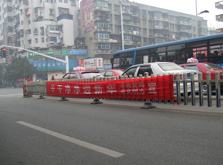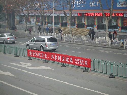 本网讯(通讯员 汪新家) 市城管局环卫处以“提醒市民爱护环境卫生、积极参与干干净净迎新年环境综合整治活动”为主题,制作了包括10项内容的40多幅宣传条幅,广泛悬挂在西陵一路、云集路、东山大道、夷陵路等人流量大的主干道交通隔离栏,积极发动市民干干净净迎新年。
