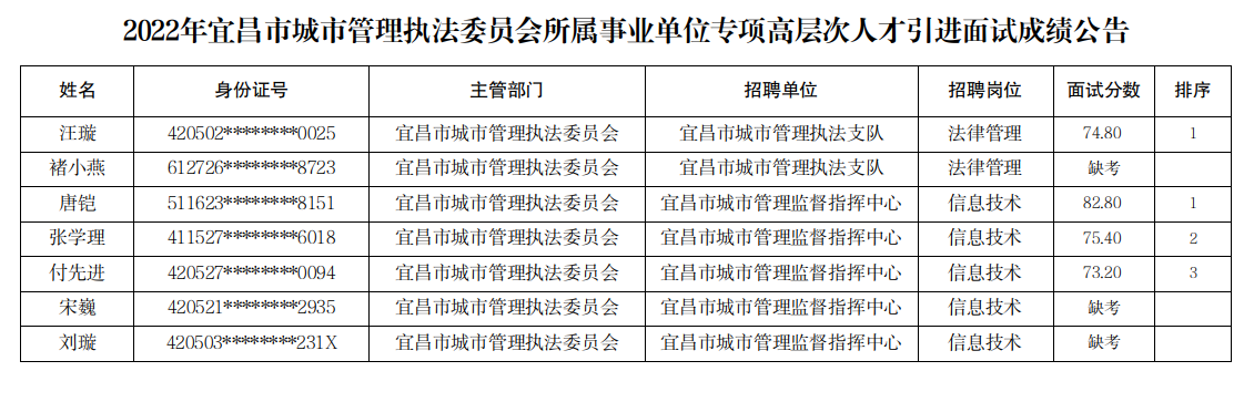 2022年宜昌市城市管理执法委员会所属事业单位专项高层次人才引进面试成绩公告
