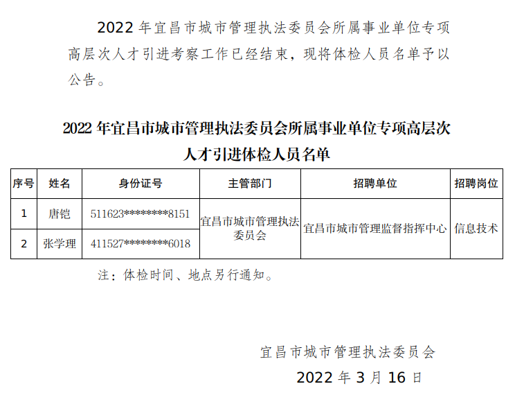2022年宜昌市城市管理执法委员会所属事业单位专项高层次人才引进体检人员名单公告