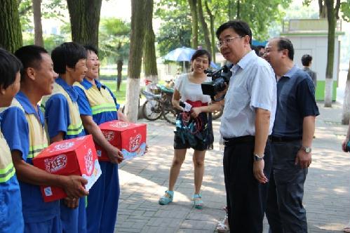 本网讯(通讯员 贺峰)7月25日下午,由市城市管理局党组书记、局长张毅带队一行,在环卫处主任毛社高的陪同下前往滨江公园公厕、胜利四路中转站慰问环卫工人,向环卫工人送上了夏日的清凉饮料。