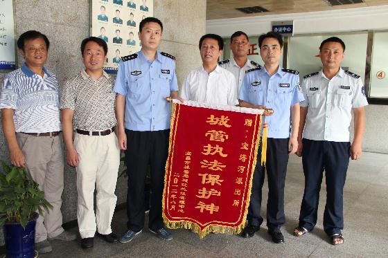 8月2日上午,市城市管理局环卫处领导和市城市管理局建筑垃圾管理中心负责人专程来到宝塔河派出所,将一面绣有“城管执法保护神”的锦旗送到宝塔河派出所副所长手中,由衷地感谢市公安局领导的高度重视、亲自过问亲手抓,派出所民警出警快速,从严从快地处理了肇事者妨碍城管队员执行公务,且执法队员被伤一案,维护了良好的城管执法形象,同时也共同维护了良好的宜昌文明市容环境。