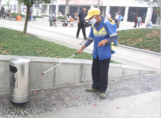 本网讯(通讯员 郑桂莲)9月23日,市城管局东站广场筹建处组织环卫人员对广场内的所有垃圾容器用“84”消毒剂进行了喷雾杀菌消毒处理。