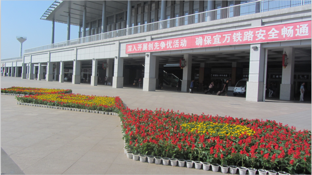 东站广场筹建处组织人员经过精心布置,在中心广场用火红的一串红和淡黄的孔雀草摆放出三个大大的菱形,简洁而美观,共用花6000余盆,将东站中心广场烘托出了浓厚的节日氛围。