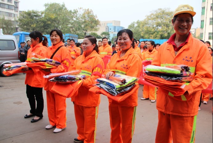 当日下午,市城市管理局环卫处院内呈现出一片橙色的海洋,在现场,宜昌市闽商投资有限公司伸出援助之手,为我们敬爱的“马路天使”捐赠工作服,用实际行动支持环卫事业发展,尊重环卫工人的劳动成果,诠释着关爱环卫工人的一份真情。此举动极大地鼓舞了环卫工人们的热情,一致表示决不辜负社会各界的关心与支持,努力工作,将以更大的热情、更好的状态投入到环境卫生建设工作中来,用自己的双手把宜昌市装扮的更加干净、美丽。