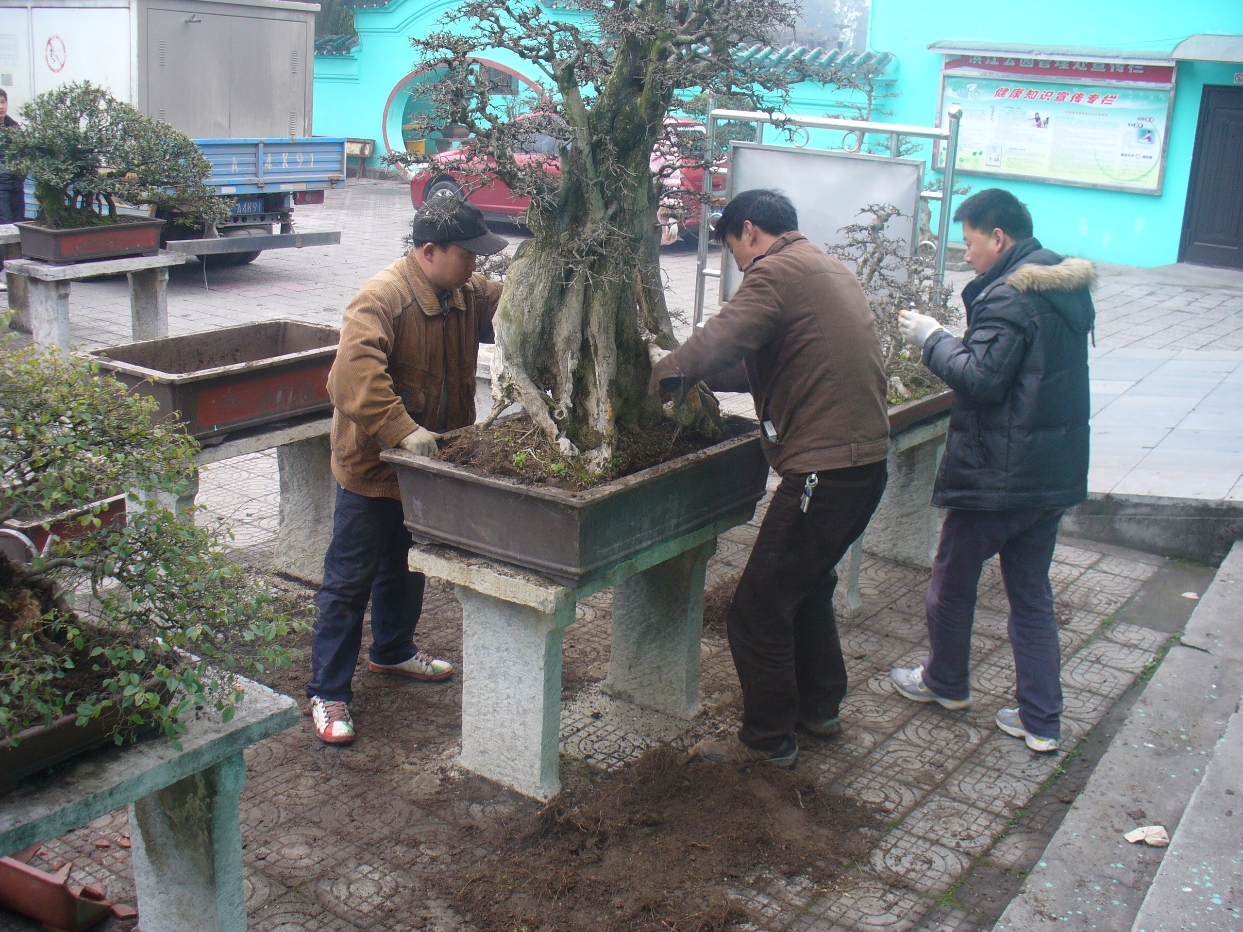 宜昌市滨江公园南榭盆景园是我市市民及游客观赏盆景的主要窗口,为了给树桩盆景全年生长打下一个坚实的基础,2月25日,盆景师傅们开始对160多盆展览树桩盆景进行换土。树桩盆景经过一年的生长,根系会盘满盆内,使盆土板结,难以透气沥水,土壤里的养料也被植物吸取得差不多了,因此盆景师傅们用腐叶土对原有盆土进行了更换。