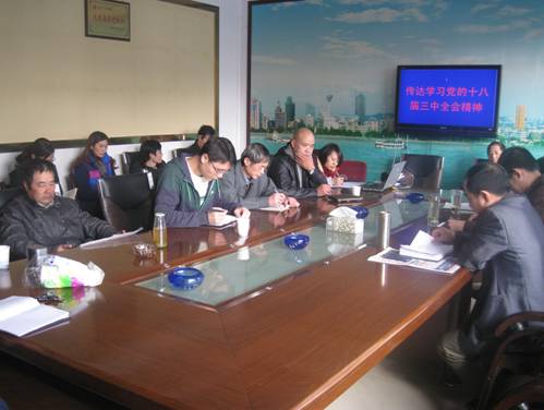 会议传达了市城市管理局11月18日召开的传达学习党的十八届三中全会精神大会的会议精神,重点对张毅局长重要讲话精神进行了贯彻学习。会上学习了《中共中央关于全面深化改革若干重大问题的决定》原文,并要求全体党员干部职工要把学习贯彻党的十八届三中全会精神作为当前和今后一个时期的首要政治任务,采取自学、集中学等方式,切实把思想和行动统一到贯彻落实全会精神上来,并做好明年的群众路线教育活动准备工作。
