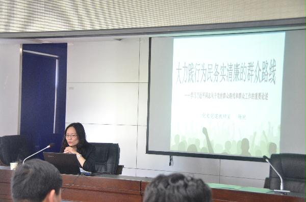 杨艳教授以《大力践行为民务实清廉的群众路线》为题,紧密结合当前的世情、国情、党情和工作实际,以密切党群关系为主线,深刻阐述了开展党的群众路线教育实践活动的重要性、必要性和深远性,并通过生动的事例启发广大干部职工把为民务实清廉的价值追求植根于心,不断提高做好新形势下群众工作的能力,始终保持同人民群众的血肉联系,为全面建成小康社会、实现中华民族伟大复兴的中国梦贡献力量。