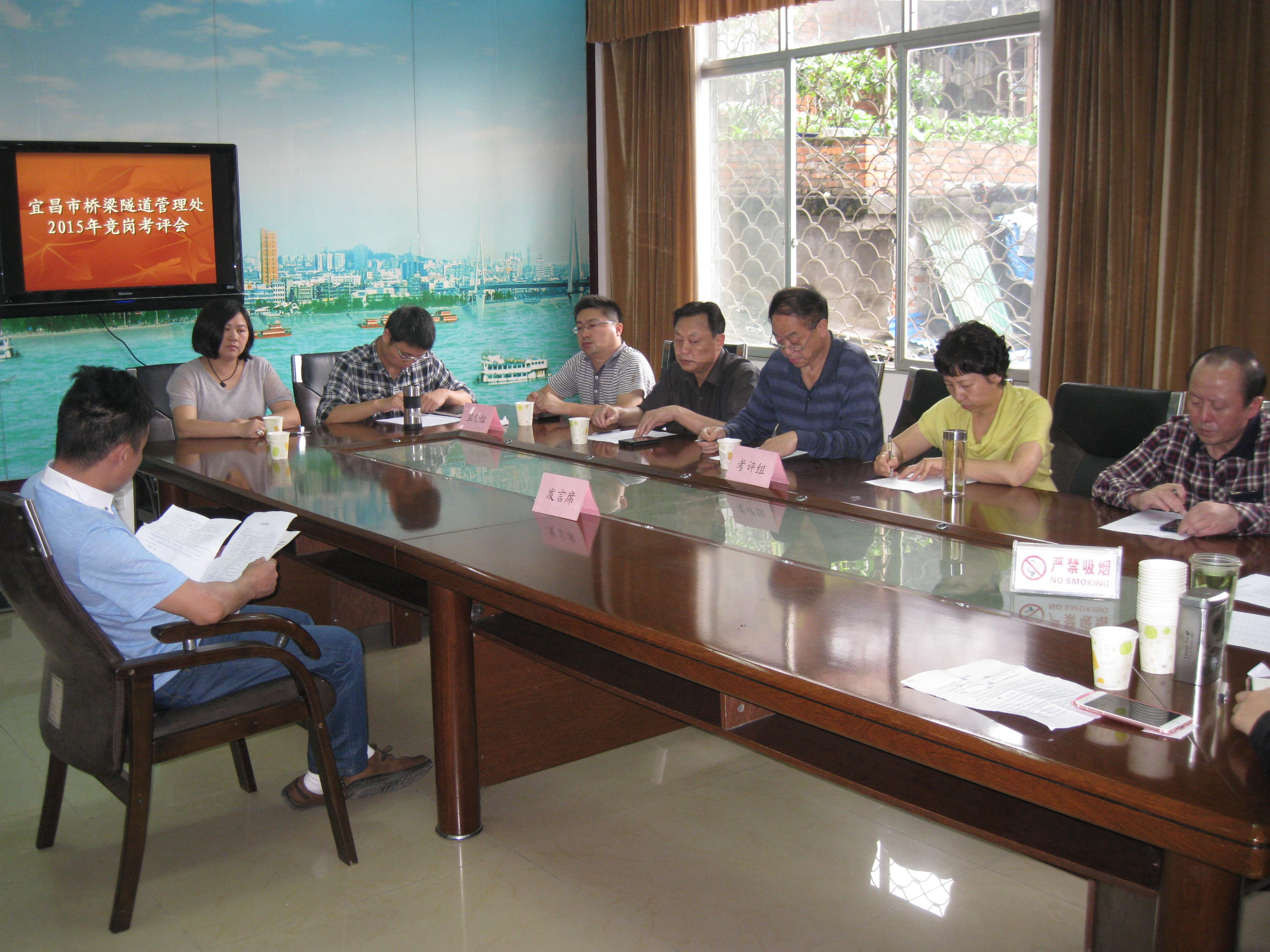 本网讯(通讯员 聂骏骅)5月26日下午,市城管委桥隧处召开了2015年竞岗考评会。由委副调研员向爱平、业务科科长胡继保、计财科主任科员江小群和桥隧处职工代表共计5人组成考评组对竞岗人员进行考评;由委监察室主任龚万柏,桥隧处副主任、纪检专干汪华,职工代表席春莲等3名同志组成的监督组全程监督考评工作。桥隧处相关人员列席会议。