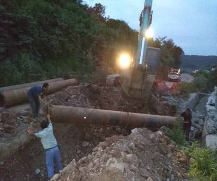 经多次大雨中现场勘察,发现填埋场库区右侧进场道路上截洪沟的唯一出水涵管,存在排水能力严重不足的重大隐患!为了不影响垃圾转运车辆通行,5月18号晚上8点至凌晨5点。根据施工方案,中心组织相关人员,连夜进行了新建排水涵管的施工作业。挖沟、吊装、焊接、铺埋、挖掘机、装载机、电焊机等齐声轰鸣,经过一夜的紧张施工,顺利将3根6米长、口径500公分的钢管焊接成18米长的过路排水涵管,并完成铺装。为该场铸牢了钢铁般的排洪管线。