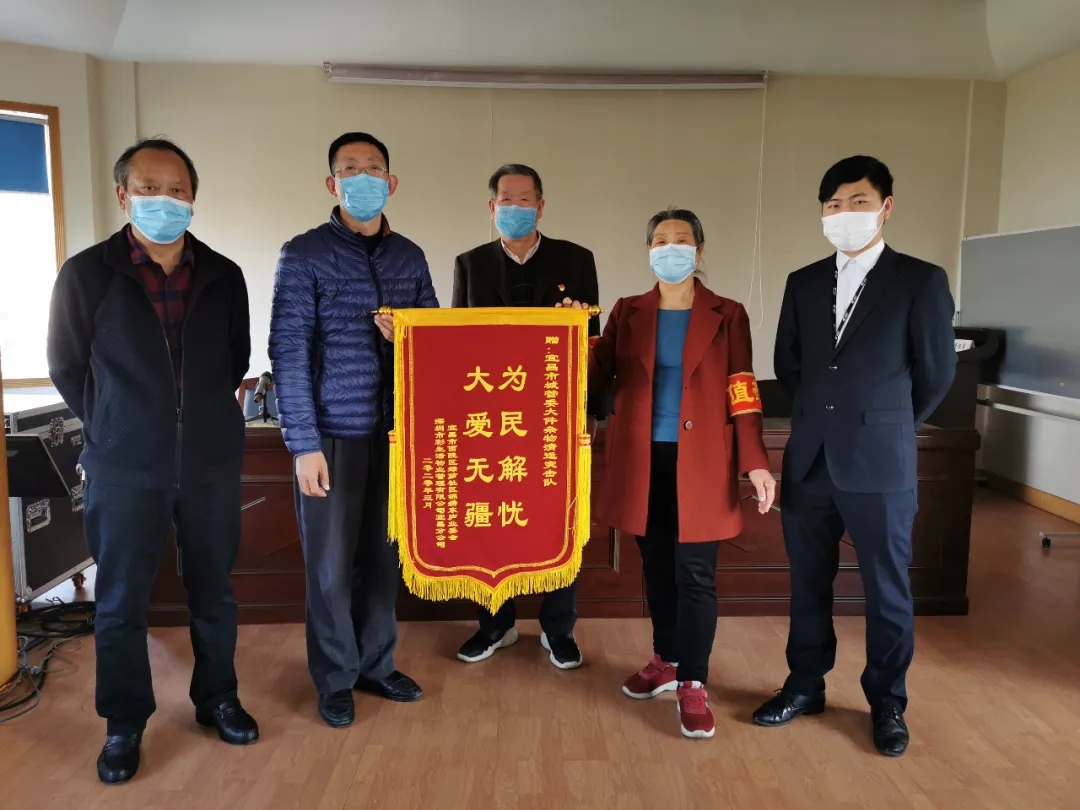 3月20日下午,锦绣东庐业主委员会携手该小区物业公司一同给市城管委环卫处大件杂物清理党员突击队送来了锦旗,锦旗上书:“为民解忧 大爱无疆”。感谢突击队员的辛苦工作,给小区居民改善了生活环境,消除了疫情隐患。