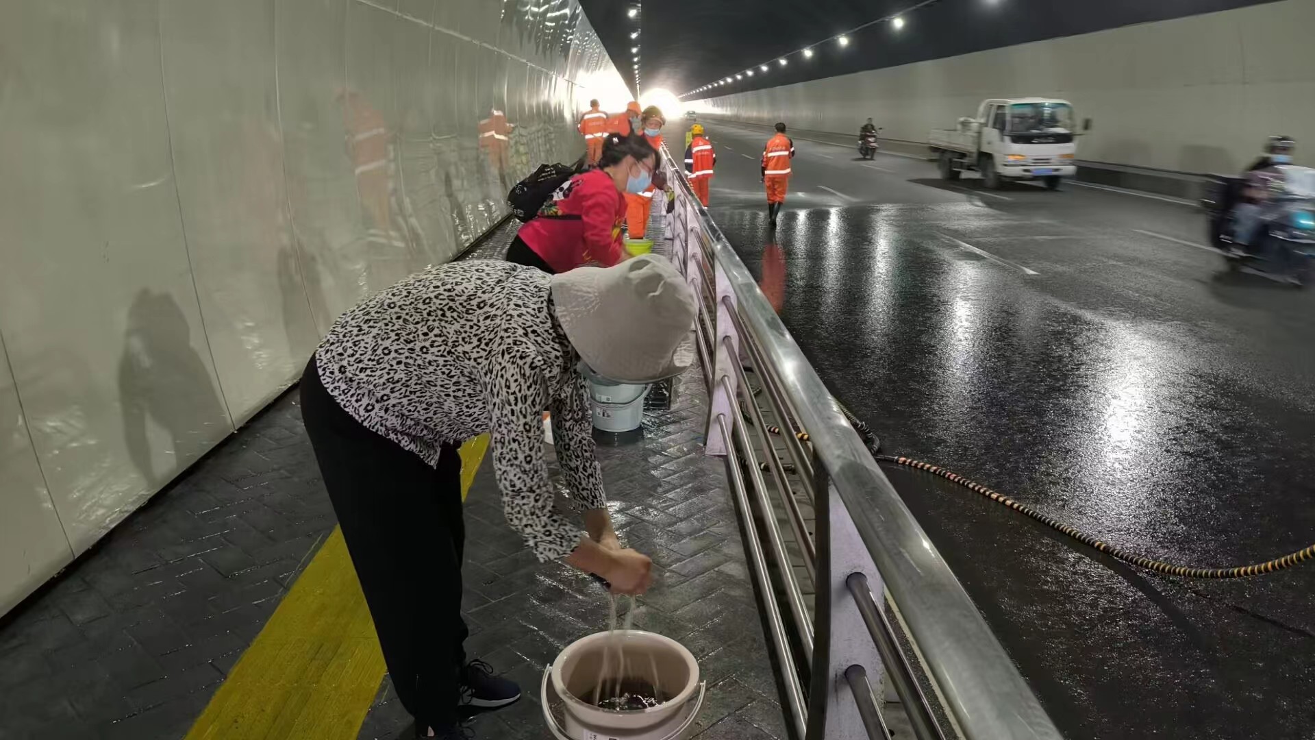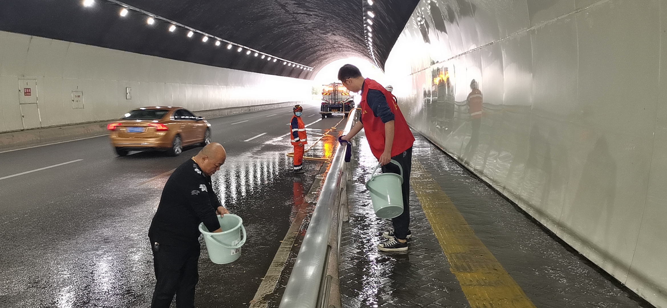 由于隧道内空间较为封闭,车辆尾气机油混合一起,很容易积沉在隧道内护栏及装饰板上,形成污渍,影响隧道美观。在活动现场,全体人员分为6组,严格落实相关工作要求,采取先用高压水枪冲洗,再进行人工擦洗的方式,开展隧道清洗工作。只见一个又一个水桶变成黑色,全体人员不怕辛苦,分工协作,干劲十足,有的拿扫帚,有的拿抹布,一丝不苟擦洗栏杆,把汗水留在隧道,把污尘清洗干净。历经数个小时,清洗工作全部完成,本次6座隧道共计2071米的护栏、装饰板等全部焕然一新,为市民营造了整洁美丽的隧道环境,为城市管理工作贡献了一份力量。(通讯员 兰宁)