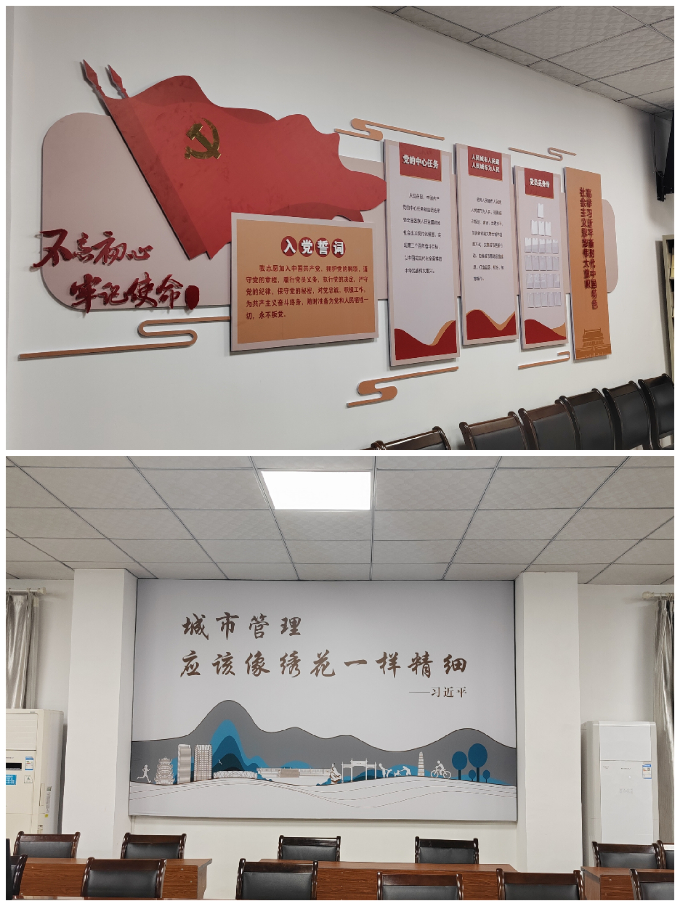 近日,市城管监督指挥中心会议室党建文化墙正式建成亮相。文化墙紧扣党的二十大报告提出的最新要求,将“党的中心任务”“人民城市人民建,人民城市为人民”理念以及习近平总书记关于城市管理工作的重要论述融入其中,同时设置“党员亮身份”版块,充分发挥党员示范引领作用。今年以来,指挥中心扎实推进基层党组织建设,不断提升党组织创造力、凝聚力和战斗力,积极打造党建文化宣传新阵地,营造浓厚党建工作氛围。