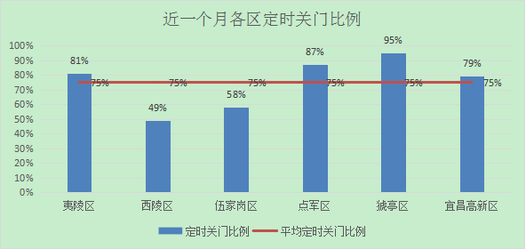 从近一个月整治数据来看,城区居民小区生活垃圾分类投放点平均定时关门比例为75%。其中:4月17日至4月26日为67.5%,4月27日至5月6日为77.33%,5月7日至5月16日为80%,整体呈上升趋势。从近一周数据来看,5月10日至5月16日,定时关门比例80%,整体情况趋于稳定。