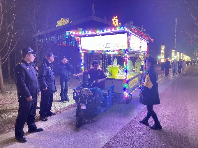 自2月7日(腊月二十八)开始,城管执法部门抽调一线城管队员,组成灯会执法保障队伍,加强秩序管控,坚持文明执法。集中力量整治灯展区域周边的出店经营、占道经营、流动经营、乱摆乱挂等不文明现象,杜绝游商小贩进入活动现场,对灯展区域的游商小贩及时劝离疏导,以文明执法营造良好的新春佳节氛围。该项工作将延续至2月24日元宵节,截至目前,共规范劝离流动摊贩200多起,保障了市民游客在干净整洁有序的环境中观赏灯会、欢度佳节。
