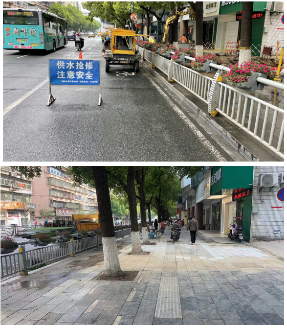 市城管监督指挥中心第一时间通过宜昌市城市综合管理服务平台将该问题派遣到伍家岗区城管局,经调查发现该水管为市浦华水务公司管养。为及时解决车辆通行消除隐患,指挥中心立即联系伍家岗区城管局以及市浦华水务公司一同赶往现场,确认情况后市浦华水务公司负责人立刻安排施工人员处理。施工人员对该处设置围挡,确保施工安全性后,抓紧时间修复破损管道。