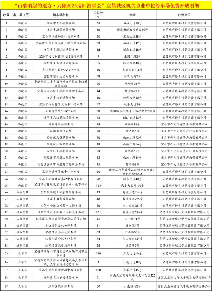 8月2日和8月3日,“山歌响起的地方刀郎2025巡回演唱会”宜昌站将在宜昌奥体中心举行。为方便“刀迷”和市民出行,宜昌城区84个机关事业单位停车场,在演唱会期间全天免费开放。