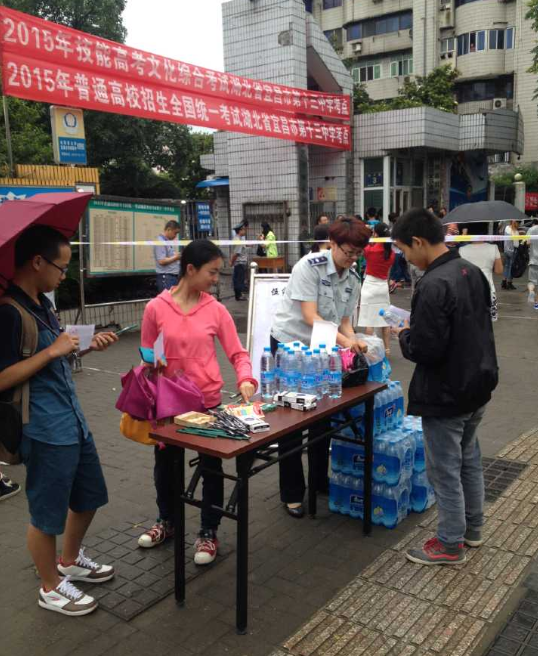 便民服务送考点,贴心护航为考生。考试当日的风雨天气给广大赶考的考生带来些许不便,有的考生急于赶考极易造成学习用具缺失、忘带的情况,伍家城管贴心考虑想在先,在辖区十三中考点门口,于风雨中增设便民服务点,免费为广大考生和陪考家长提供矿泉水、2B铅笔、中性笔、削笔刀、橡皮擦等物品。