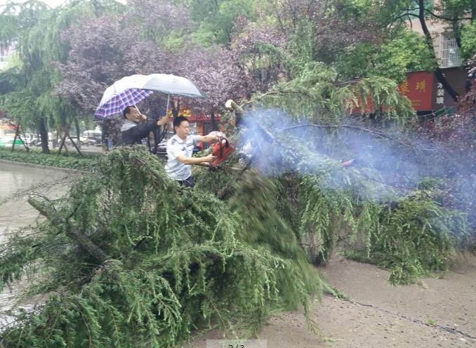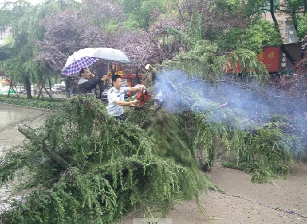 本网讯(通讯员 李海榕)6月17日上午,狂风暴雨突袭宜都,加上连日阴雨,道路两侧许多行道树不堪重负,出现倾斜现象,有的拦腰折断甚至连根拔起。园林大道人民广场对面一颗胸径30厘米的雪松倾倒在道路中间,城河大道移民局门前一颗胸径15厘米广玉兰倾倒在地,长江大道地税局对面一颗近5米高的塔白倒伏,给过往行人和车辆造成安全隐患。城管局园林绿化科立即行动,携带绿化高空作业车、电锯等设备到现场清理,及时排除安全隐患。