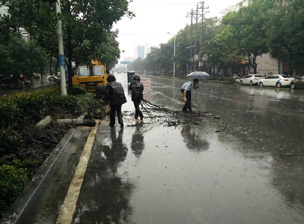 园林绿化工人顶着狂风骤雨快速作业,队员的衣服很快被淋湿、鞋子进水、全身泥泞。1小时20分钟后,倾倒的树木、枝桠全部被清理结束,道路恢复了往日的通畅。