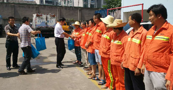本网讯(通讯员 徐耀龙 冉春玲)7月28日,市城管委和西陵区政府领导来到宜昌桑德环卫有限公司看望慰问一线环卫工人,对他们高温下仍然坚守岗位的爱岗敬业精神表示高度赞扬,并为他们送去防暑降温用品。