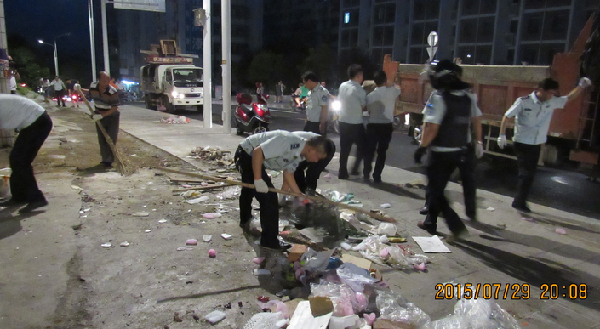 本网讯(通讯员 谭志智)为改善丹阳路气象局周边路段的市容市貌,保障楚天市场改造工程的如期开工。7月29日晚7点30分,县城管执法大队20余名执法队员,在局机关工作人员和茅坪镇、滨湖社区工作人员的协助下,加班加点对楚天市场周边的违章占道经营摊点进行了集中清理。执法人员不惧酷热,不怕脏,亲自动手搬运各类占道物资,清理各种占道垃圾,经过近三个小时的辛勤劳动,共清理固定摊位33个,取缔各类临时摊点62个,清运各类垃圾6卡车。