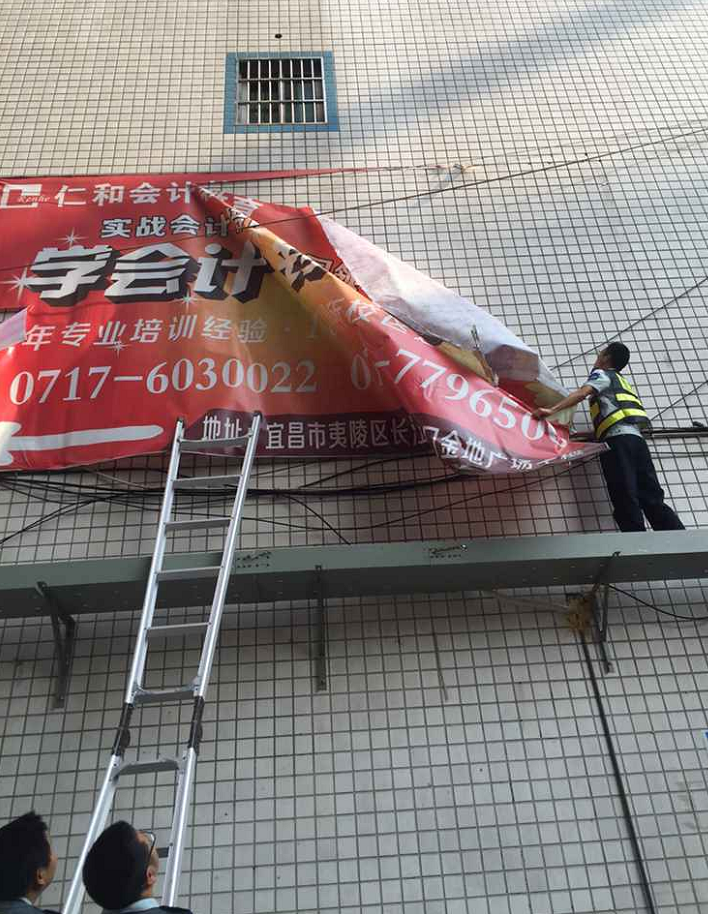 夷陵城管:变身“蜘蛛人” 拆除建筑立面破损广告