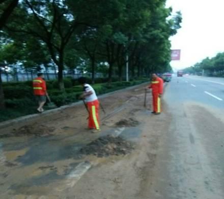 由于猇亭区区内仍存在部分裸露山体及未硬化道路支路口。每逢汛期雨水较大时,雨水会将泥沙冲至路面,不但影响环境卫生,对道路交通还会造成一定影响。针对该情况,区城管局将汛期对泥沙污染路面现象纳入应急预案,要求三家环卫市场化作业单位实时掌握天气情况,一旦出现较大面积的泥沙现象,立即组织清淤工作。7月13日晚7点起,环卫工人应急队赶到现场后,手持铁锨一铲一铲归拢泥沙。将泥沙清理归拢成堆,装车运走。调派水车采取由内向外的方式整体冲刷路面,最后出动高压清洗车再次洗刷路面。截止晚10点,环卫工人应急队加班加点将被污染路面冲洗干净,恢复了318国道路面干净整洁。