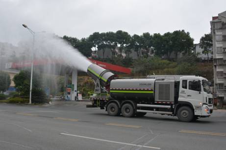 本网讯(通讯员 李琳)近日,夷陵区平湖大道上,一辆多功能抑尘车正在缓慢地行驶,只见此车车身很长,车尾装载着一个“大炮”不断地喷射出浓浓的“水雾”。