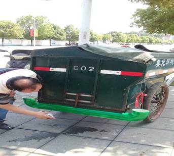 亿净公司管理员金华平同志利用汽车旧轮胎,剪断一半后破开,用铁丝挂在保洁车的前端可防滴漏,但是轮胎做的不好操作,也不美观。在此基础上,靓洁公司多年来从事环卫清运工作的徐洪波同志,对“轮胎版”的装置进行了改良。他将pvc管道比着保洁车长短破开5公分的口子,然后在其两端安上配套的弯管,最后用铁丝挂在车的前端,如同一个大口罩,以其轻便、美观、经济、实惠、好操作,得以推广运用。目前,按此方法改造的保洁车已有13部。