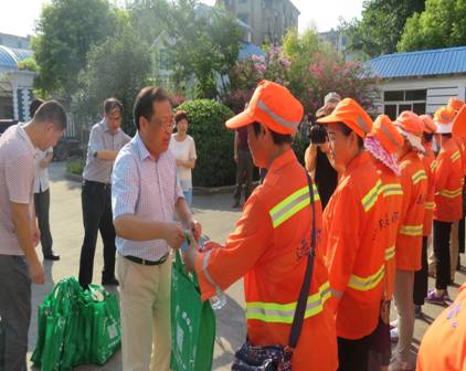 在垃圾中转站北站大院内,汤明亲切地与环卫工人代表一一握手,并将清凉饮料和防暑物品送到他们的手中。他对环卫工人战高温、抗酷暑、勇于奉献、坚守岗位的精神给予充分肯定和赞扬,为他们对洁净城市所付出的辛勤劳动表示感谢,希望环卫工人再接再厉,为市民创造更加优美舒适的市容环境。并再三叮嘱环卫处同志,要合理安排好环卫工人作息时间,在保障城市市容环境整洁的同时,细致到位地做好防暑降温工作,确保环卫工人健康和安全。