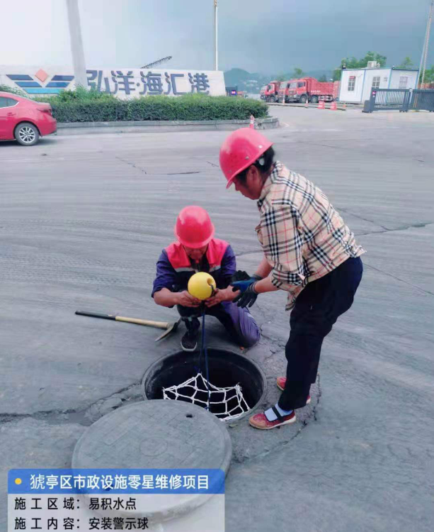 为进一步完善各项防汛应急防范措施,近期,猇亭区城市管理执法局组织人员在城区路段10个易积水区域的雨水井盖内部分别安装了黄色警示浮漂球。平日,警示漂浮球由尼龙绳穿过浮漂球中心孔固定在防坠网两端,当遇到暴雨,路面积水过深,管道内雨水过大掀翻窨井盖时,警示漂浮球则漂浮在路面积水上,发挥它的重要作用——警示路人,此处危险,不要靠近!可有效警示路人此处有坑洞危险,提醒路人远离,避免安全事故发生,保障路人及车辆在雨天行驶安全。