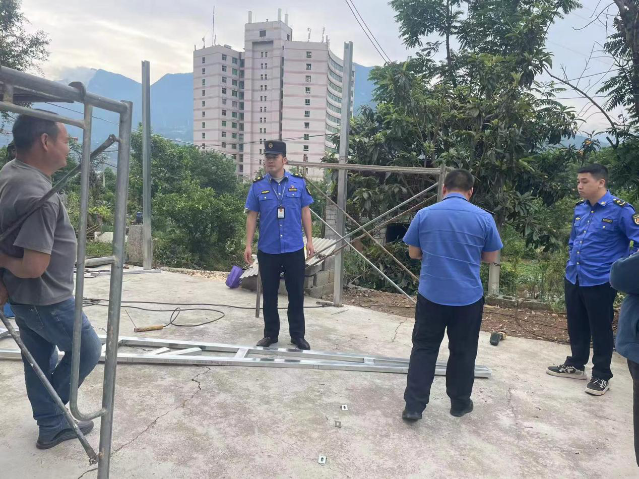 5月3日上午,县城管局值班组在巡查时发现书洞沟小区一居民门前摆放了两组脚手架,两名工人正在切割、焊接不锈钢材料。执法人员当即上前询问,得知两名工人受居民雇请准备搭建钢架棚,该居民不在家,无法取得联系。执法人员随即要求工人停止作业。